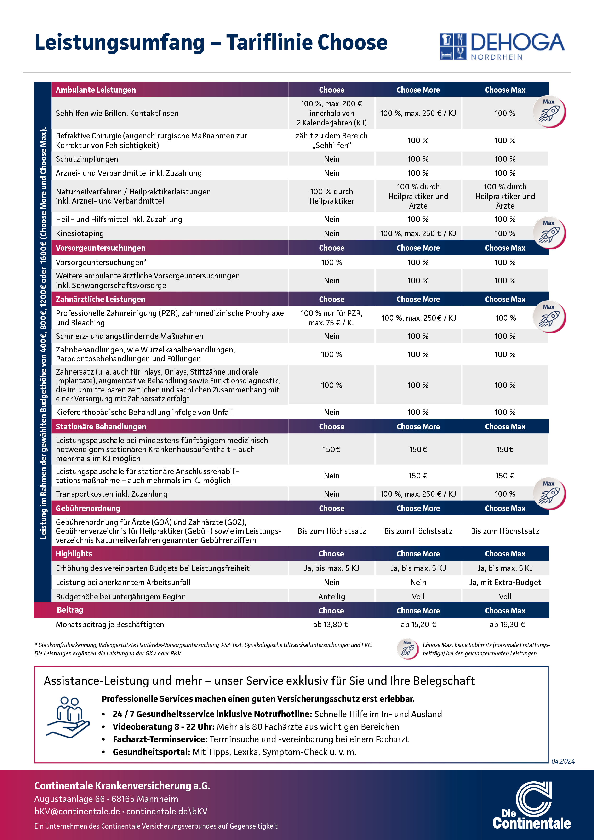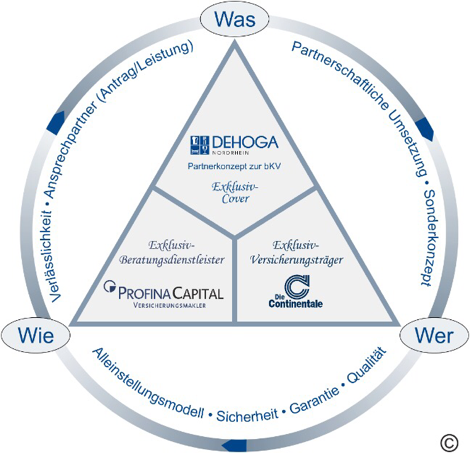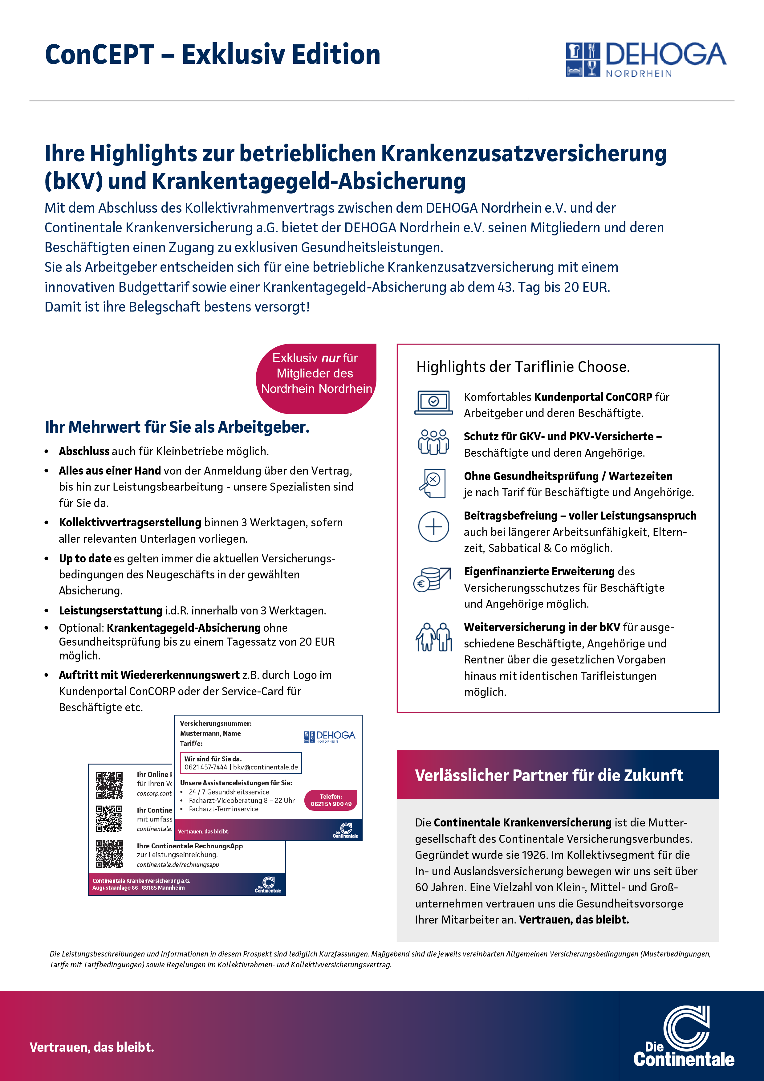 Der DEHOGA Nordrhein hat einen exklusiven Rahmenvertrag mit der Continentalen Krankenversicherung a.G. geschlossen. Die Beratung und der Vertrieb wird über den Dienstleistungspartner PROFINACAPITAL GmbH abgewickelt.